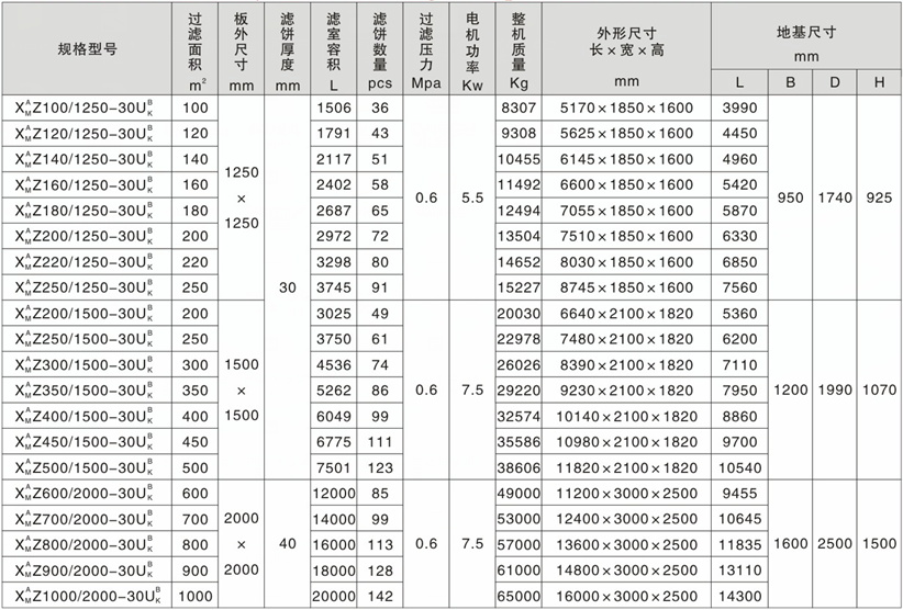 1250/1500/2000型液壓自動拉板壓濾機技術參數