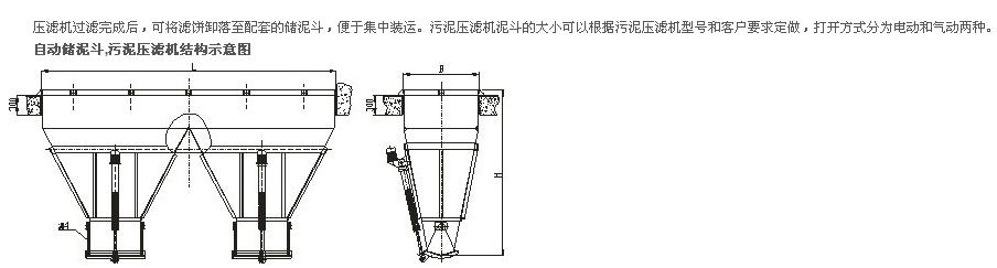 儲泥斗是在壓濾機過濾完成后,可將濾餅卸落至配套的儲泥斗,便于集中轉運。泥斗的大小可以根據壓濾機型號和客戶要求定做,儲泥斗打開方式分為電動和氣動兩種。